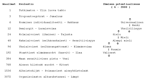 Evoluutio on ylöspäinen liike, jossa aineen ja hengen suhde muuttuu henkisyyden lisääntyessä; Gurdjieff kutsuu tätä "aineen spirituoitumiseksi". Evoluutioluokkien välillä tapahtuu keskinäiseen ylläpitoon kuuluvaa energioiden vaihtoa ja eksistenssin muuntumista. - Taulukon luokitusperiaate ei ole biologinen, vaan entiteettien essenssin eli näkymättömän perusluonnon potentiaalisuuteen perustuva. Kuvioon on merkitty sekä eksistentiaalinen ilmentäjä että essenssin tyypillinen ominaisuus tai ilmentymistapa.